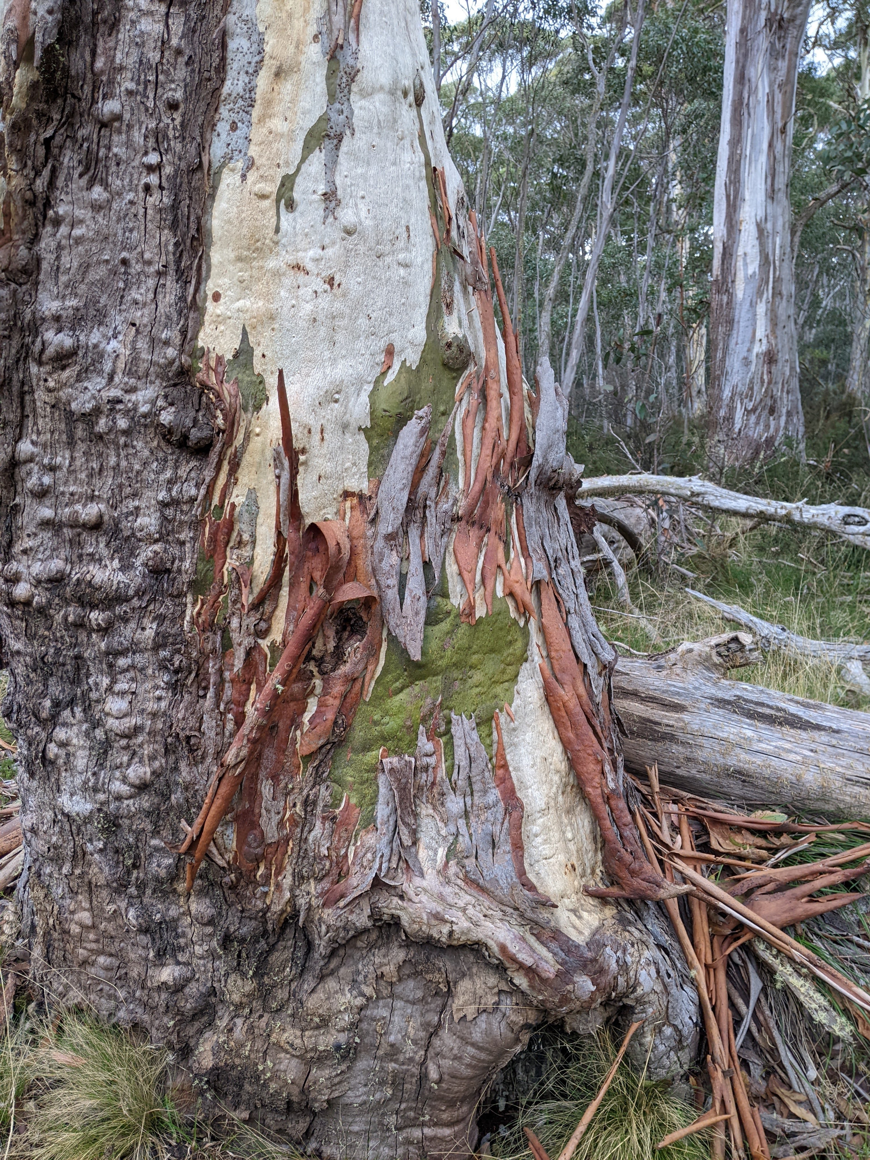 Day 2 is a 16 km walk along the meandering, pleasant Cascade Trail – it’s a fire trail with two vehicle ruts to follow among the ash. The sky clouds over as the day progresses – we’re expecting rain tonight and the next day. It’s already been a wet season, so fungi are out in full swing. Flaking bark reveals multi coloured tree trunks.
