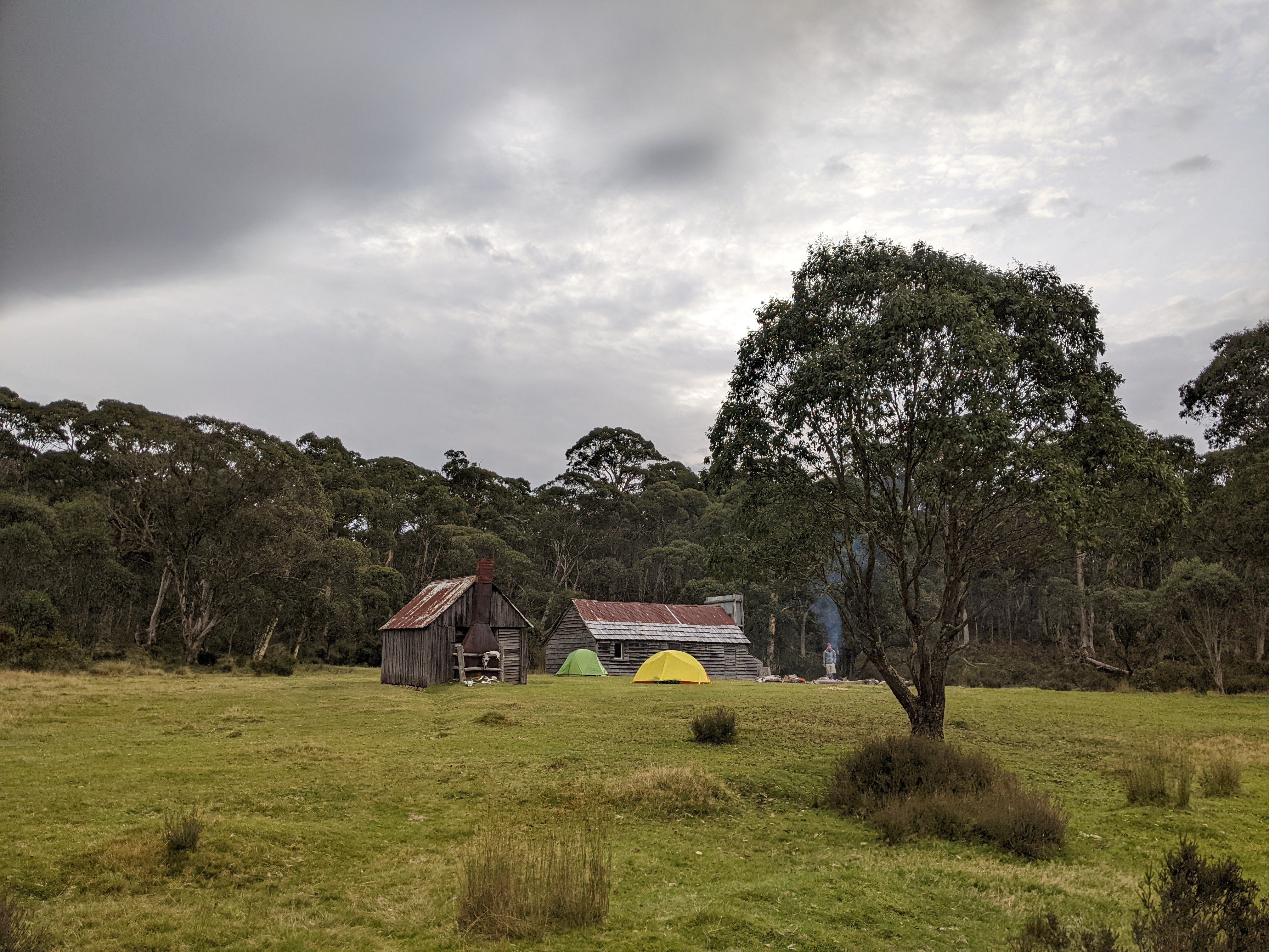 It’s only mid afternoon, so we take our time settling in here – pitching tents, moving them to flatter spots, investigating the two huts, getting water, watching the horses. Two of them are clearly very used to human company, and hang around on the flats by the creek and near the huts. Encountering them on the way to the loo in the dark isn’t much fun for either party.