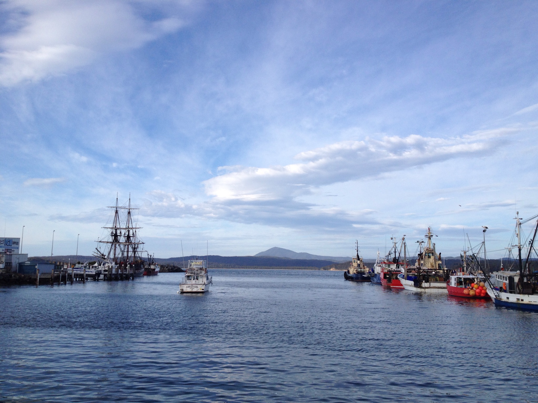 I am here in Eden with the Endeavour replica and her dark heavy rig stands out against the water of the bay. Yesterday 660 people came aboard the ship to see her and imagine something of life in Cook’s time. This interests me less than the sight of the ship herself and the way tall ships are so entirely unique in filtering into their background of wave or bush and seeming so at home yet centuries out of place.