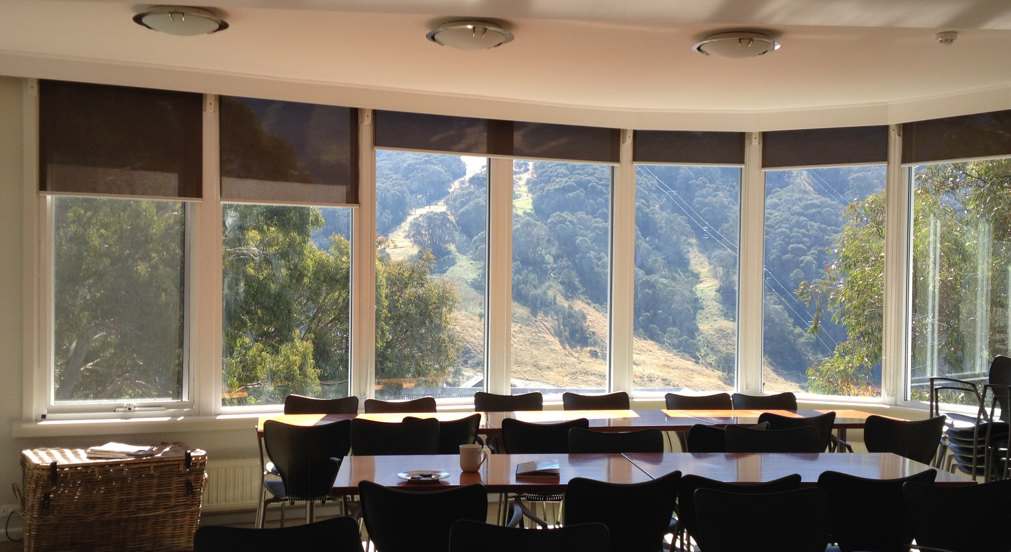 I’m in the dining room of a lodge at Thredbo Alpine Village, watching sunlight fall in fast-moving patches down the face of the opposite slope, by turns illuminating the lines of the chairlift as strings of silver or softening the bush into shadow.